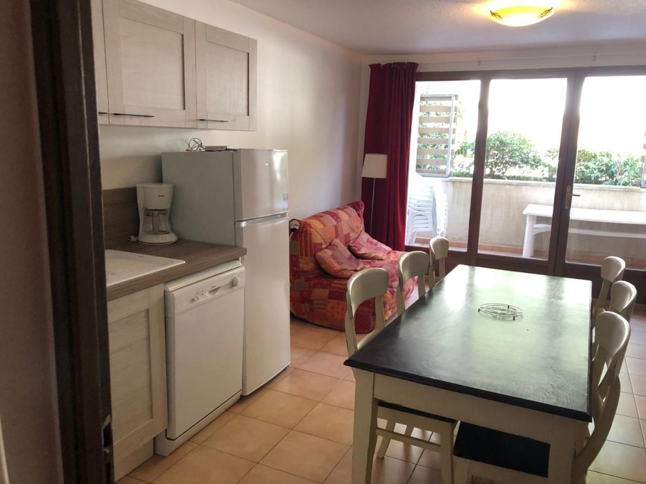 Chaque appartement moderne du Lagrange Grand Bleu Vacances - Résidence La Closerie dispose dune kitchenette entièrement équipée avec plaques de cuisson et four micro-ondes. Lhébergement possède également un balcon avec un coin salon.