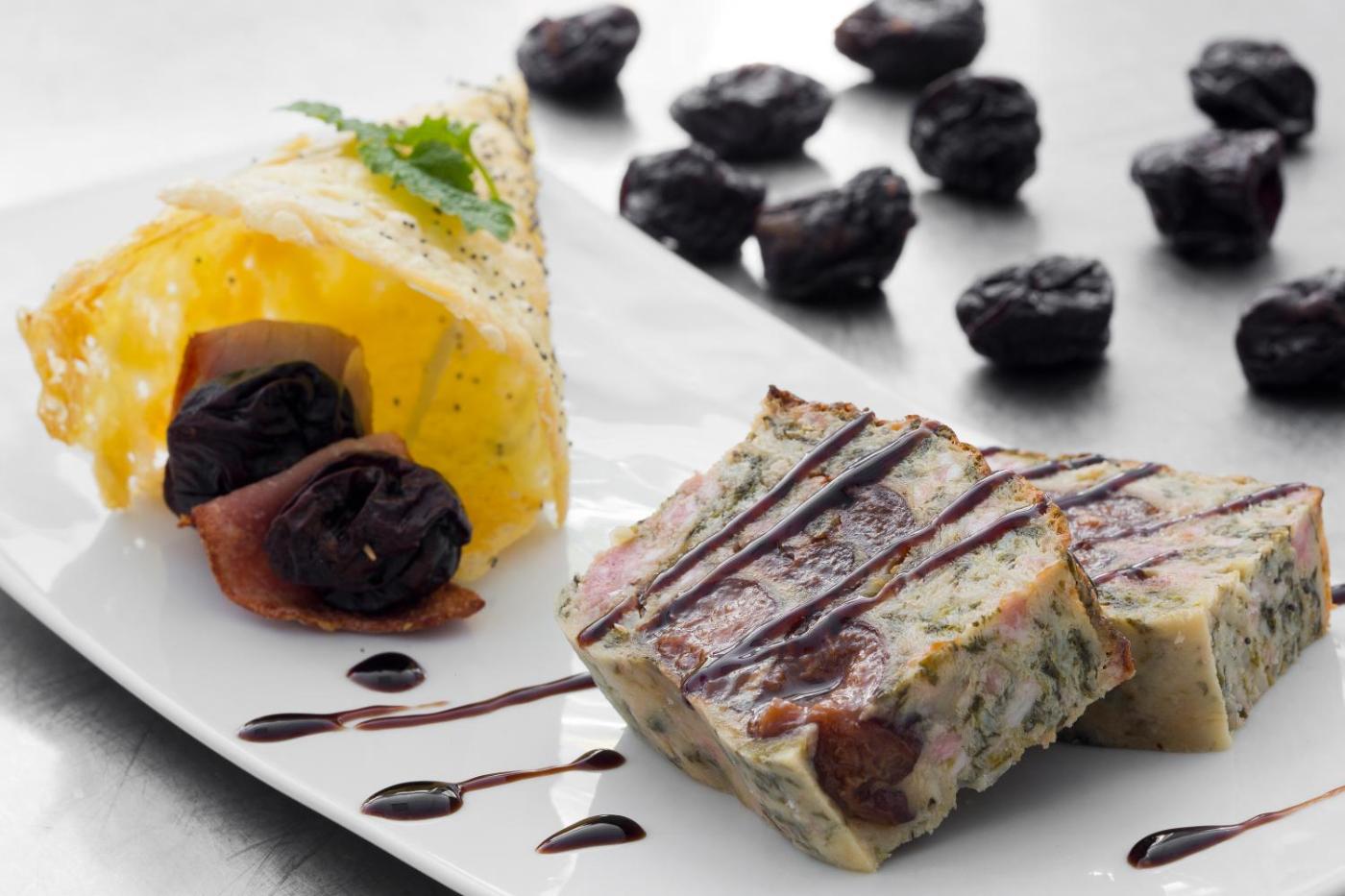 Le restaurant, qui comprend une terrasse panoramique, sert des plats traditionnels et de saison élaborés à partir de produits frais du terroir. La salle à manger à la décoration claire abrite une cheminée.