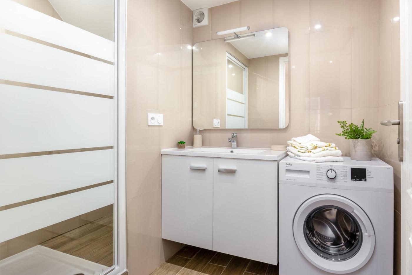 Appartement 1 Chambre. Featuring a private entrance, this air-conditioned apartment is comprised of 1 living room, 1 separate bedroom and 1 bathroom with a walk-in shower and a hairdryer. In the well-fitted kitchen, guests will find a stovetop, a refrigerator, a dishwasher and kitchenware. The apartment offers a flat-screen TV with streaming services, a washing machine, a tea and coffee maker, a seating area as well as city views. The unit offers 2 beds.
