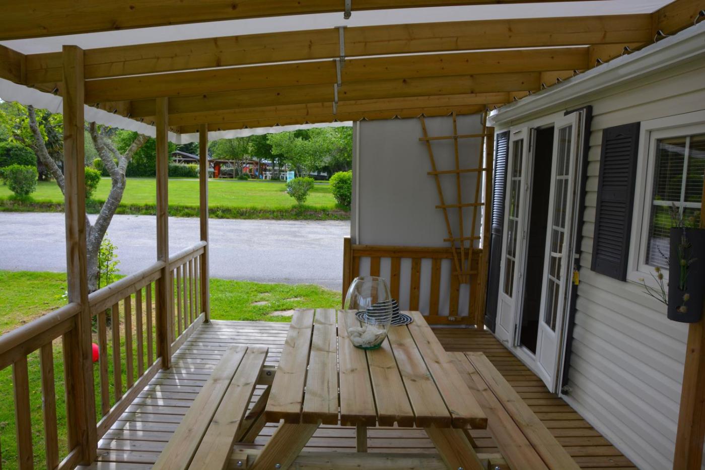 Mobile Home Supérieur. Boasting a private entrance, this mobile home includes 1 living room, 2 separate bedrooms and 1 bathroom with a shower and a hairdryer. Guests can make meals in the kitchen that has a stovetop, a refrigerator, a dishwasher and kitchenware. Featuring a terrace with garden views, this mobile home also offers soundproof walls and a flat-screen TV. The unit has 3 beds. ;