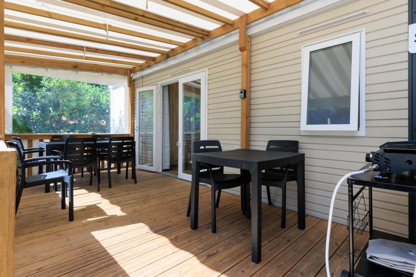 Mobile Home. Boasting a private entrance, this air-conditioned mobile home features 1 living room, 3 separate bedrooms and 1 bathroom with a hairdryer. The well-equipped kitchen has a dishwasher, kitchenware, an oven and a microwave. Featuring a patio, this mobile home also features a coffee machine, a barbecue and a TV with satellite channels. The unit has 4 beds and 2 futons.