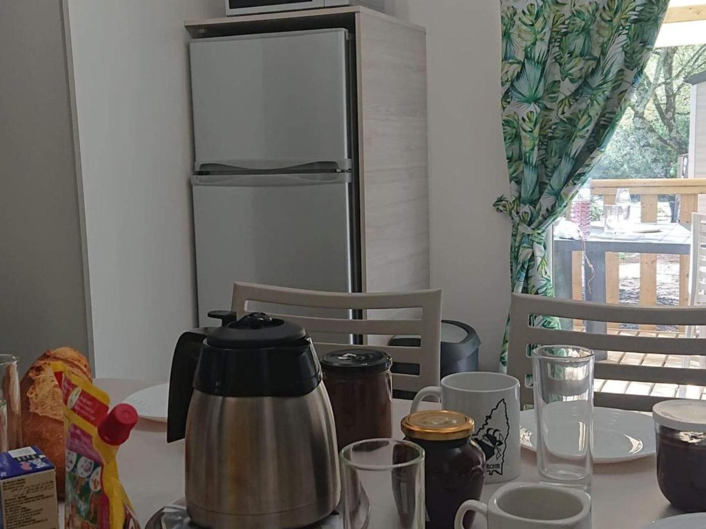 Mobile Home. Boasting a private entrance, this air-conditioned mobile home includes 3 bedrooms, 1 bathroom and a kitchen. In the fully equipped kitchen, guests will find a refrigerator, kitchenware, a microwave and a toaster. The mobile home offers a coffee machine, a dining area, as well as a terrace and outdoor furniture.